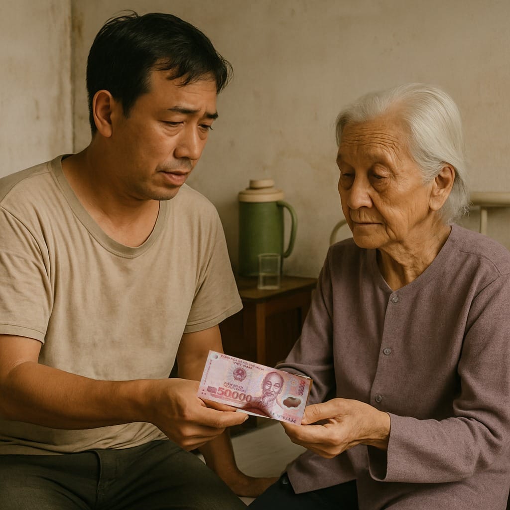 Nhờ số tiền ấy, bà Năm được phẫu thuật thành công. Dù sức khỏe yếu đi nhiều, bà vẫn sống thêm được gần một năm. Trong những ngày cuối đời, bà thường nắm tay Dũng, nói: “Con là phúc của mẹ. Mẹ chẳng có gì quý, chỉ có lòng biết ơn.” Một buổi chiều, khi chỉ có hai mẹ con, bà run rẩy lấy từ gối nằm một tờ 50 ngàn cũ kỹ, nhét vào tay Dũng. “Con giữ lấy, đừng tiêu. Mẹ dặn rồi, con nhớ nhé,” bà nói, ánh mắt đầy ý nghĩa. Dũng gật đầu, cất tờ tiền cẩn thận, dù chẳng hiểu vì sao.