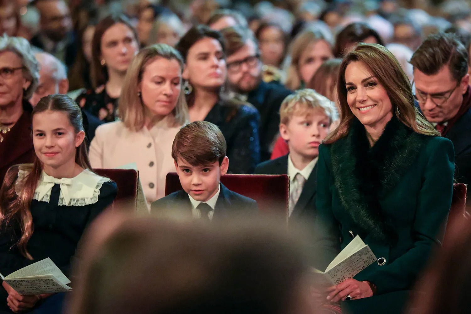 Princess Kate and her family, from left, Prince George, Princess Charlotte, Prince William and Prince George at the carol service at Westminster Abbey on Dec. 5, 2025.Credit :